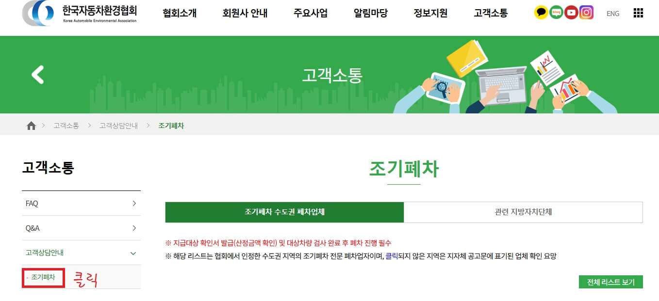 고객상담안내 클릭 후 우측 하단 조기폐차 클릭 하시면 전국 조기 폐차 가능 폐차장 조회 가능합니다