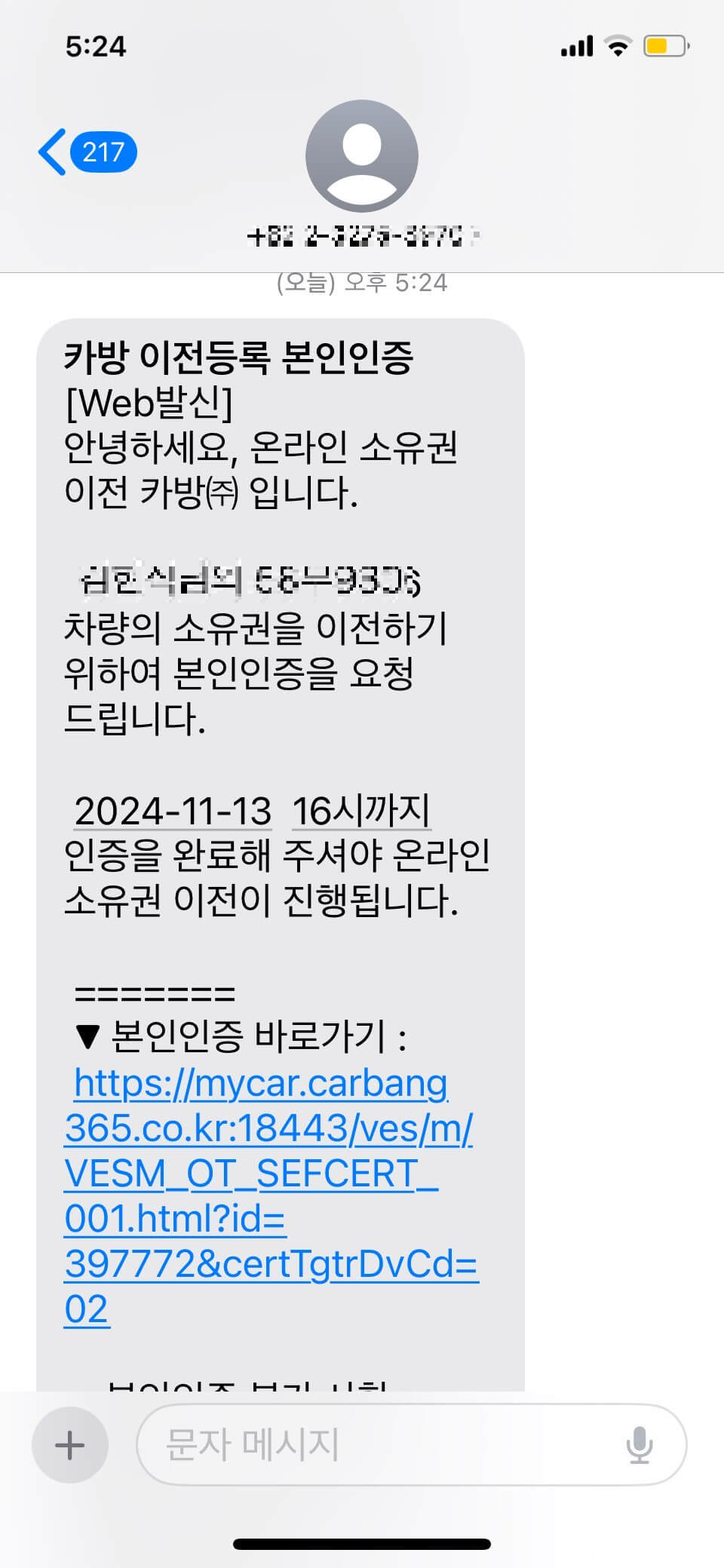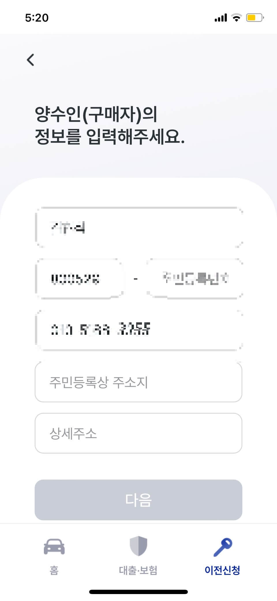 4.양수인 양도인 소유이전 본인 인증 메세지 수신 작성 동의 하면 어플 인증 화면 진행중으로 변경