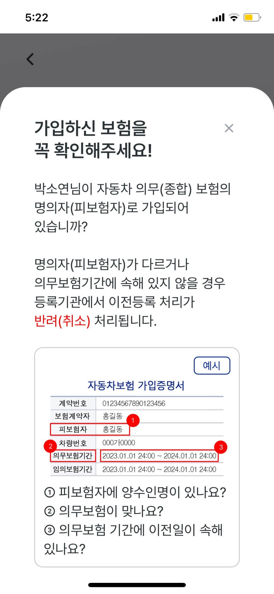 3.양수인 양도인 정보 입력 책입 보험 가입 확인 팝업