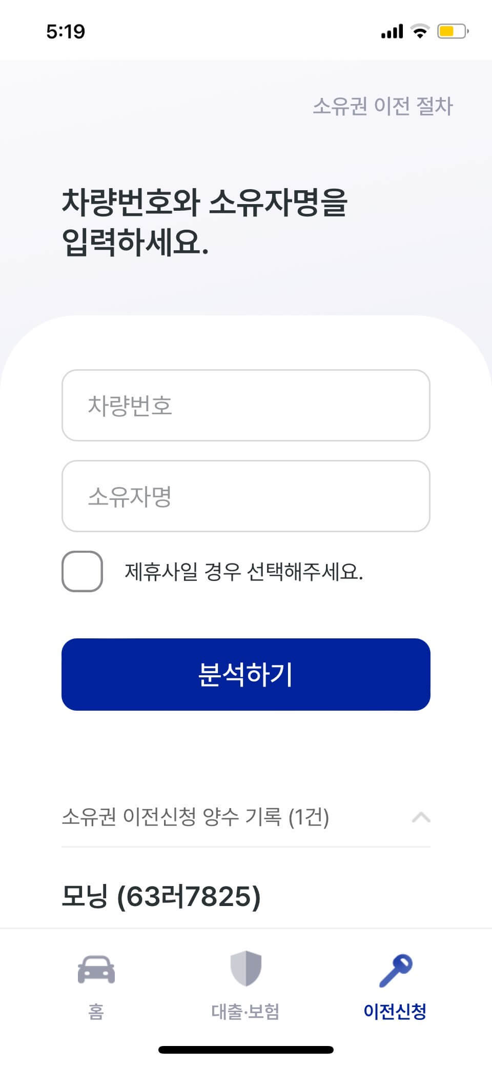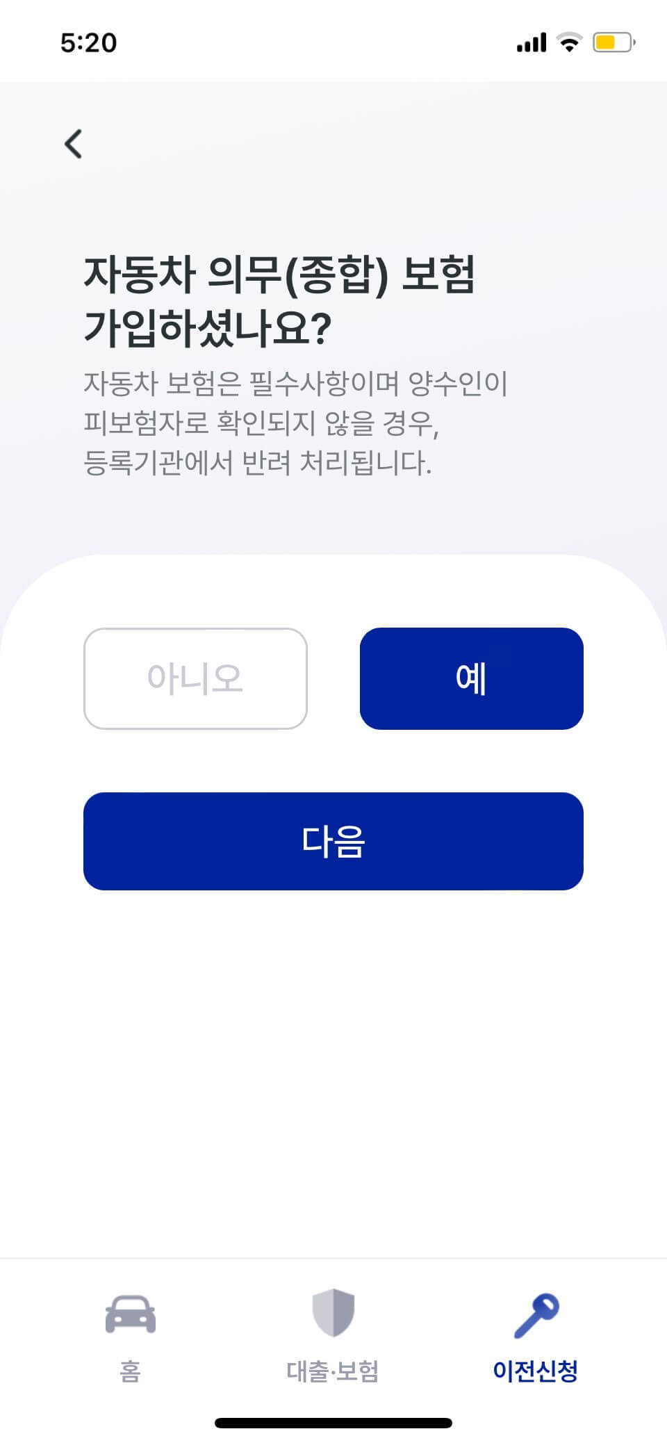 2.차량소유자 정보 입력,소유권 이전등록 시작, 양수인 종합보험 가입 확인 (아니오 선택하면 보험가입 절차 진행)