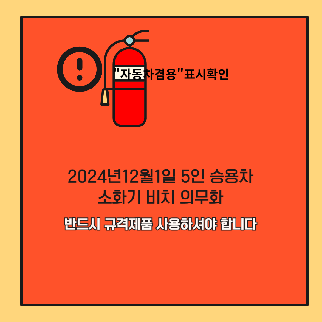 2024년 12월 1일부터 5인승 이상 승용차에도 차량용 소화기 설치가 의무화됨에 따라 반드시 규격소화기를 비치하여야 하며 위반시 범칙금이 부과 됩니다.기존차량엔 소급적용 되지는 않습니다.